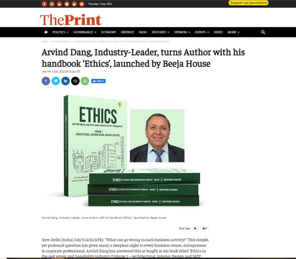New Delhi [India] July 5 (ANI/ATK): “What can go wrong in each business activity?” This simple, yet profound question has given many a sleepless night to every business owner, entrepreneur & corporate professional. Arvind Dang has answered this at length in his book titled ‘Ethics in the real estate and hospitality industry (Volume 1 – Architectural, Interior Design and MEP Services), launched globally by India’s one and only mentored publishing house. The author has probed this question by deep diving into these three oceans of design processes and capturing the answers in a structured manner.